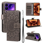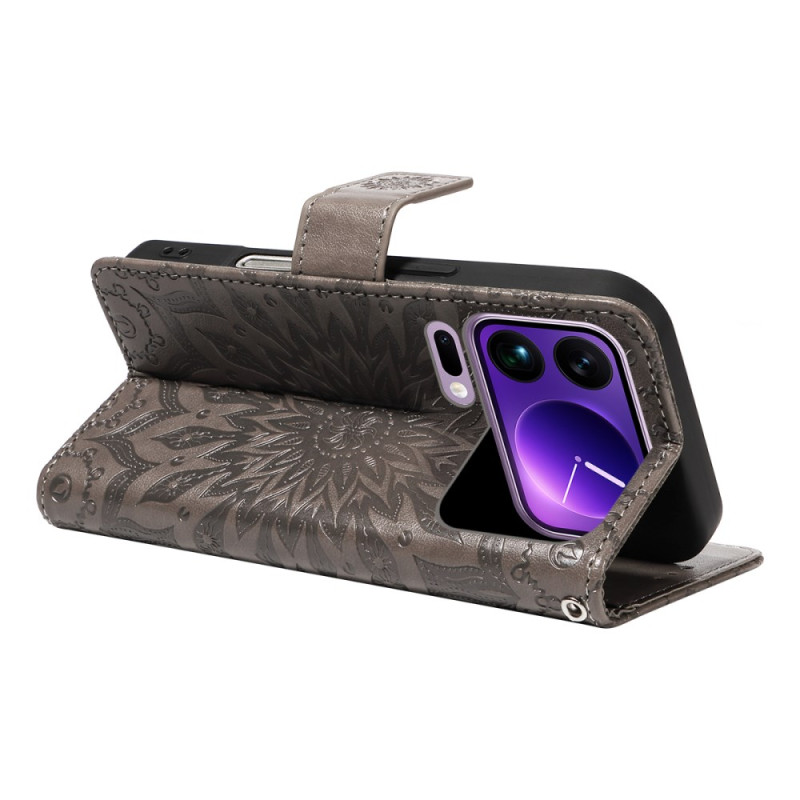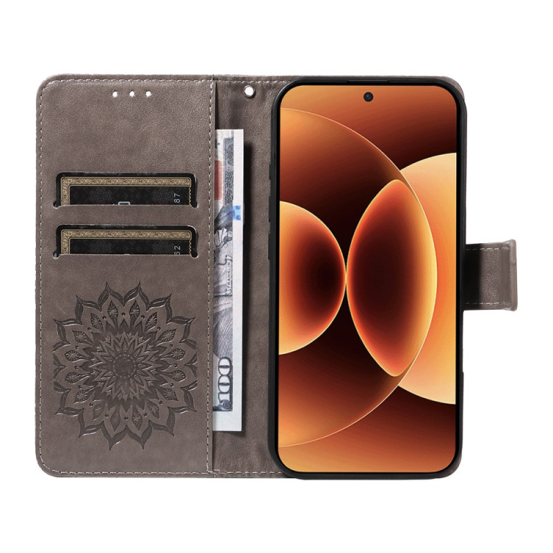 Elegante funda de piel de PU con motivo de girasol en relieve, que ofrece una sólida protección y funciones prácticas. Incluye ranuras para tarjetas, compartimento para billetes, función de soporte y colgante para la muñeca, todo ello en un refinado diseño que combina estilo y practicidad.