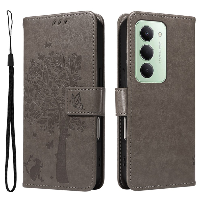 Funda monedero de piel de primera calidad con diseño de gato y árbol para Xiaomi Redmi 15 4G (EU). Ofrece una protección elegante y resistente con funciones prácticas como un soporte integrado, ranuras para tarjetas y una colgante de mano.