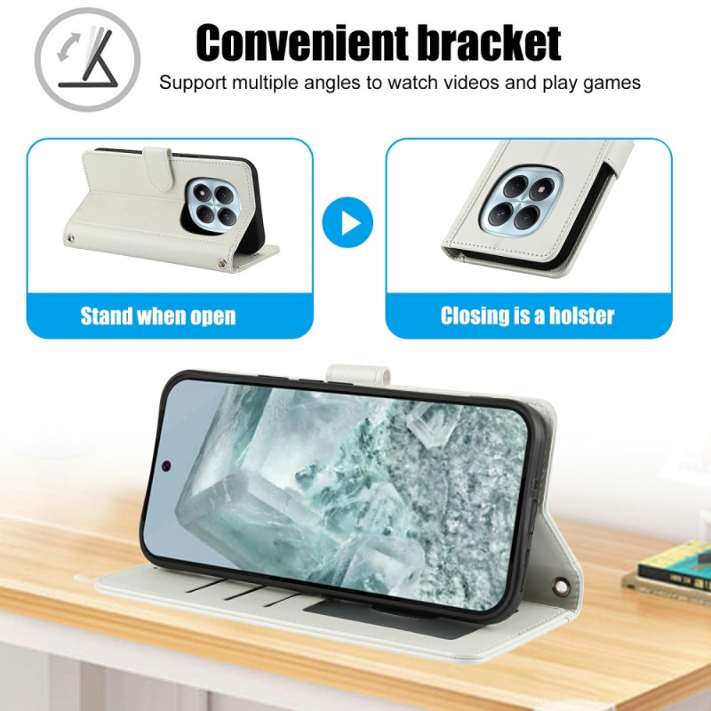 Elegante funda cartera de cuero PU para Xiaomi Redmi Note 15 Pro 4G. Incluye 3 ranuras para tarjetas, 1 bolsillo para billetes, soporte integrado y colgante de mano extraíble. Protección completa con cierre magnético seguro.