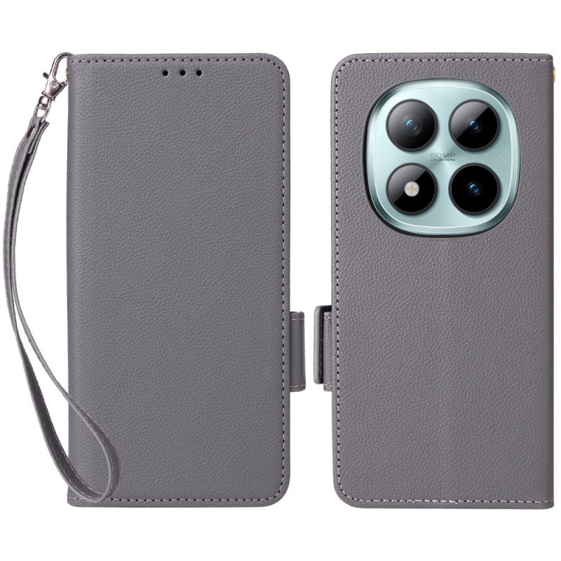 Elegante funda monedero de piel de PU con textura de lichi para Xiaomi Redmi Note 15 Pro 5G. Función manos libres, cierre magnético y colgante para la muñeca incluidos. Protege tu teléfono con estilo mientras mantienes tus tarjetas esenciales a mano.
