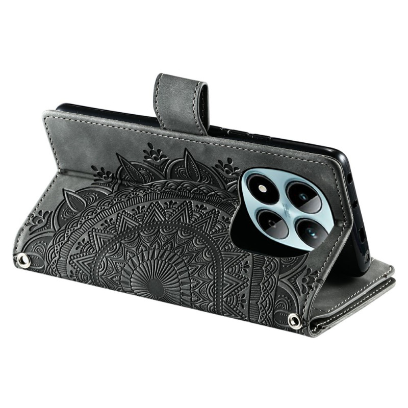 Elegante funda monedero de cuero PU con motivo de mandala para Xiaomi Redmi Note 15 Pro 5G. Cuenta con múltiples ranuras para tarjetas, soporte plegable, cierre magnético seguro y práctica colgante de mano.