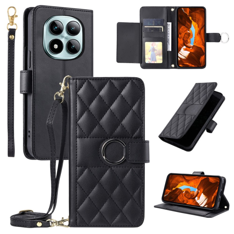 Étui multifonction en cuir PU premium avec design rhombus élégant. Comprend un anneau pratique, support intégré, 5 emplacements pour cartes et poche monnaie. Livré avec deux bretelles ajustables pour porter à la main ou en bandoulière.