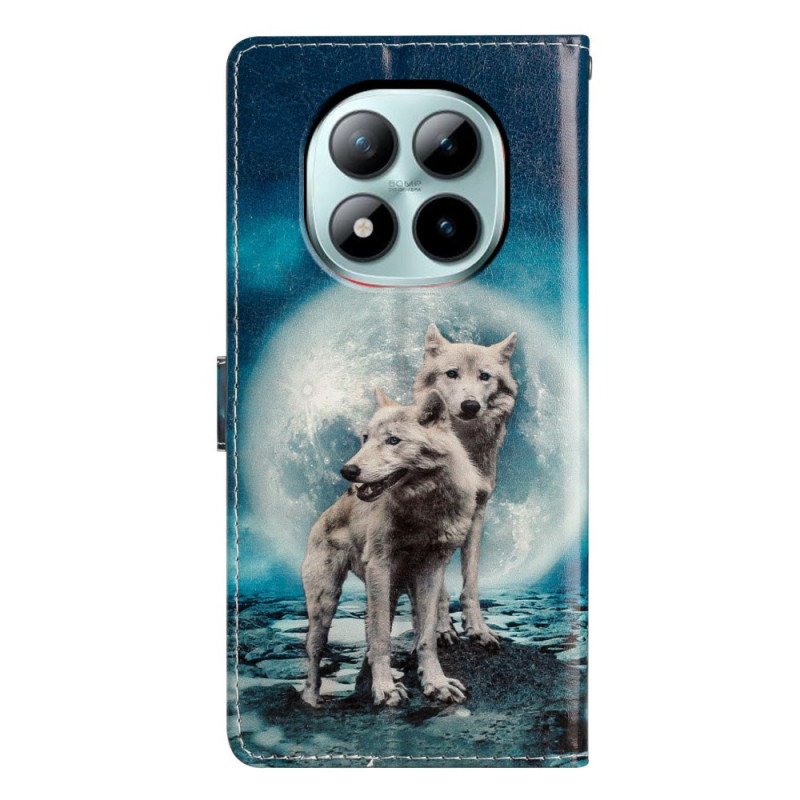 Elegante funda cartera con motivo de dos lobos para Xiaomi Redmi Note 15 Pro Plus 5G. Diseño sofisticado con soporte integrado, 3 ranuras para tarjetas y cierre magnético seguro. Incluye una práctica colgante de mano para facilitar su transporte.