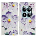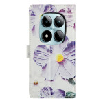 Elegante funda con solapa y motivo de flores moradas para Xiaomi Redmi Note 15 Pro Plus 5G. Incluye 2 ranuras para tarjetas, 1 compartimento para fotos, soporte plegable integrado y colgante de mano desmontable. Cierre magnético seguro para una protección óptima.