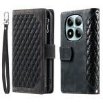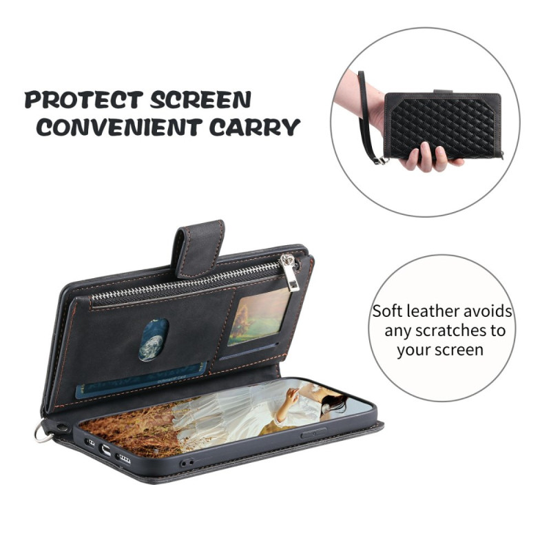 Elegante funda cartera de cuero PU con patrón de diamante cosido para Xiaomi Redmi Note 15 Pro Plus 5G. Con múltiples ranuras para tarjetas, bolsillo con cremallera y función de soporte. Cierre magnético seguro y práctica colgante de mano incluida.